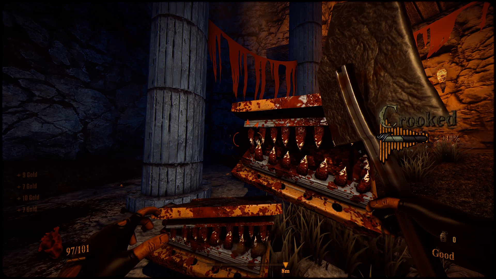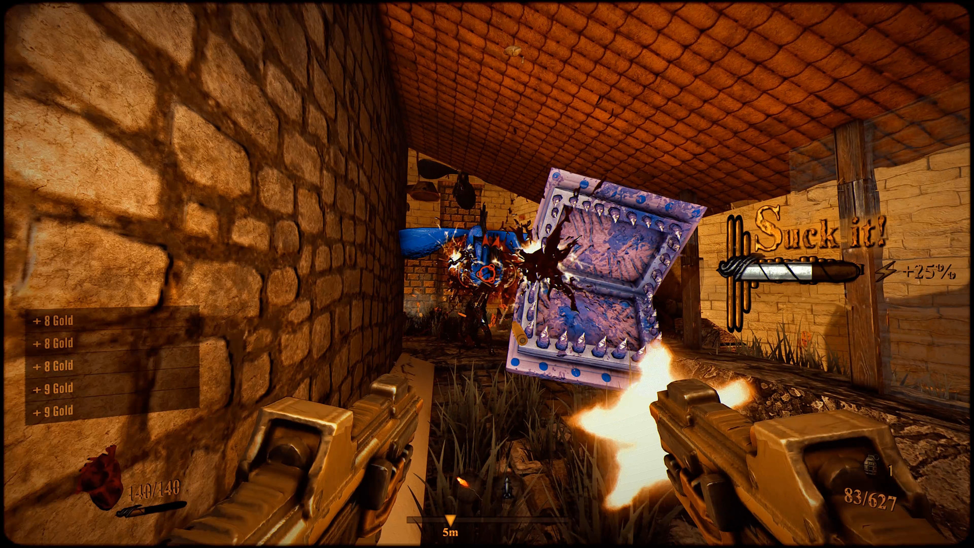 Being that Devilated also has some of that looter shooter DNA you’ll find weapons strewn around the levels, hidden in treasure chests and also in lovely secret areas which allude to something a little more than it first seems, you’ll be juggling these in your inventory and buying/selling at the trader who appears in a small hub section at the start of every stage, it’s also available via a portal at select parts of the stage.
