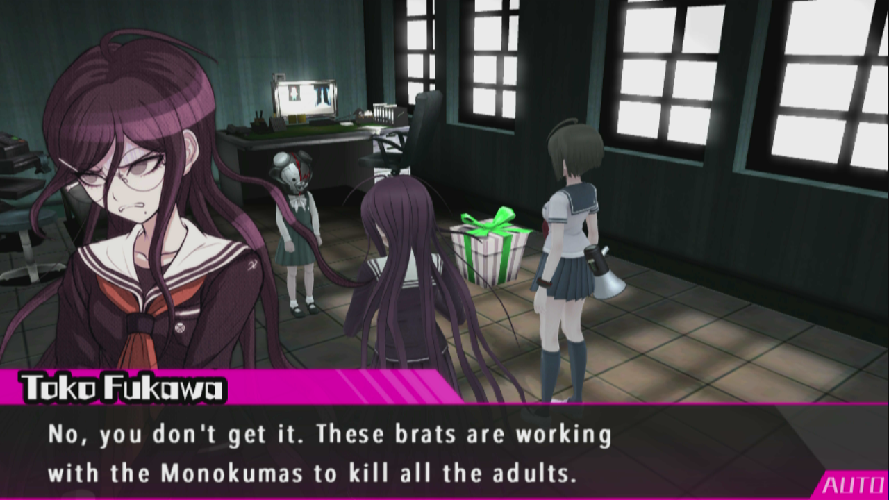 This is where the main plot and game play of the game begins. You are dropped back into Towa City and are now part of a little game the Warriors like to call, the Demon Hunt with you (and any other adults) being the Demons. You do not fight this fight on your own though. Soon after your are dropped into the city you come across Toko Fukawa, a survive from Hope Academy, who joins up with you as she is an Intern for the Future Foundation and their task is to keep Komaru safe. However, she is a very strange character with a violent (but useful) split personality and has some very sexual fantasies about the leader of the Future Foundation but because she is such a polar opposite of Komaru, it works well.